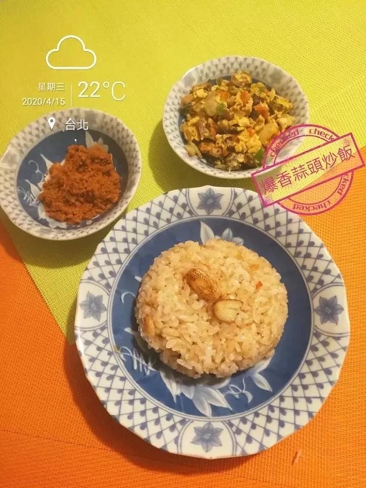 游出電子業海域的美人魚老妹 做过 早餐•2020年4月15日 #早餐•2020年4月15日# 🌹老媽的招牌炒飯🌹我小時候的年代物資沒有那麼豐富,早餐店也很少的,前一晚剩下的剩飯剩粥再熱也不好吃,老媽就會用蒜頭拍兩下爆香炒剩飯剩粥加點醬油就是好吃的"爆香蒜頭炒飯",雖然簡單但卻非常好吃,尤其炒的時候要炒到有點恰恰的(焦焦的)但又不到鍋巴程度,好吃的不得了😋🍀爆香蒜頭炒飯🍀時蔬炒雞蛋🍀肉鬆🌹祝福大家天天開心🌹 2020-04-15