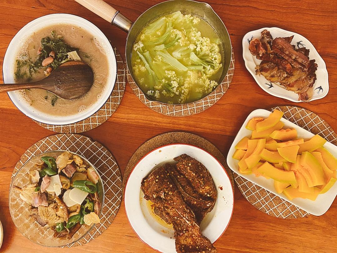 蒸南瓜,蒸腌鱼,青椒炒野生香菇,鸡汤花菜,红豆腌菜,烟熏腊肉