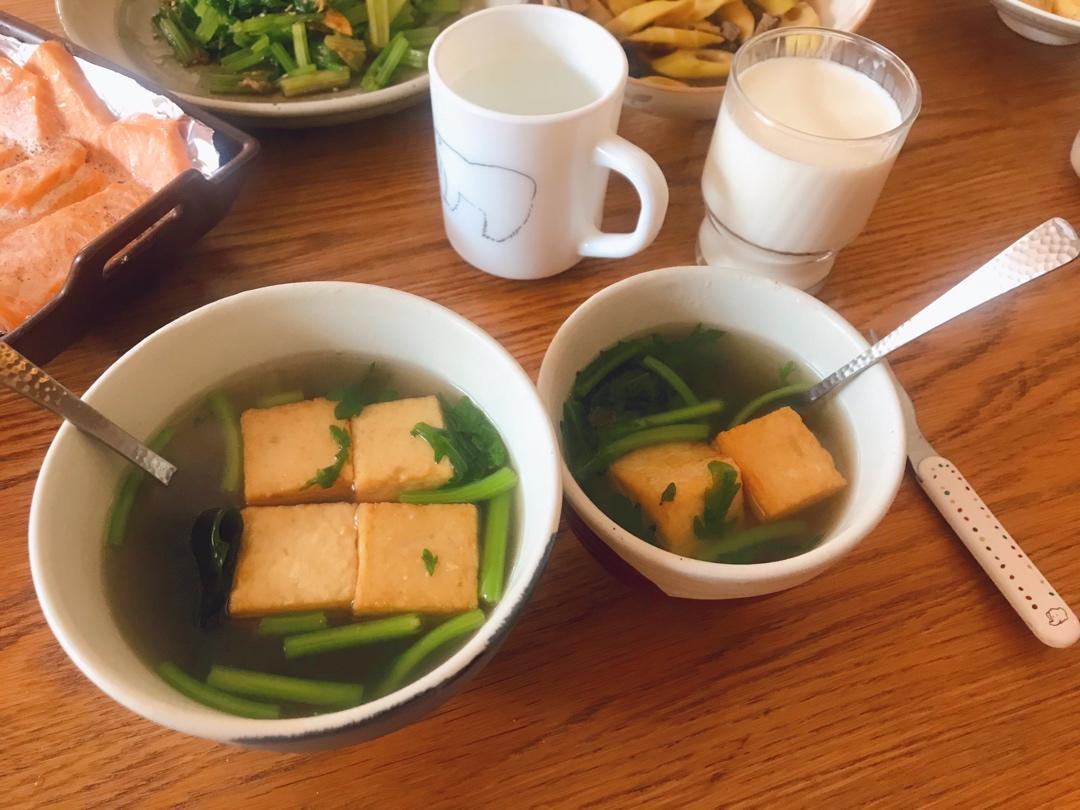 小美好 做过 记录生活;) 今天吃炒竹子,感受下熊猫生活,院子里又开始长竹笋了,想留着炖肉,最近一直没肉,还是挖出来炒着吃了,蒜泥芹菜,吃点粗纤维吧,喜欢芹菜叶和蒜泥,买的生鱼片,家属表示国内生鱼片不安全,那烤烤吃了吧😢很好吃,琢磨什么鱼没什么刺,可以切断腌制早晨烤箱烤一下就OK了 可以多吃鱼。家里剩余食材做的汤,胖芯表示一股日料店的味道,还是用海带和木鱼花熬底,放上爱吃的食材就可以了,避免吃太多油,味道鲜美,鱼豆腐Q弹,家里绿叶菜只有茼蒿了,味道也不错。 2020-04-18