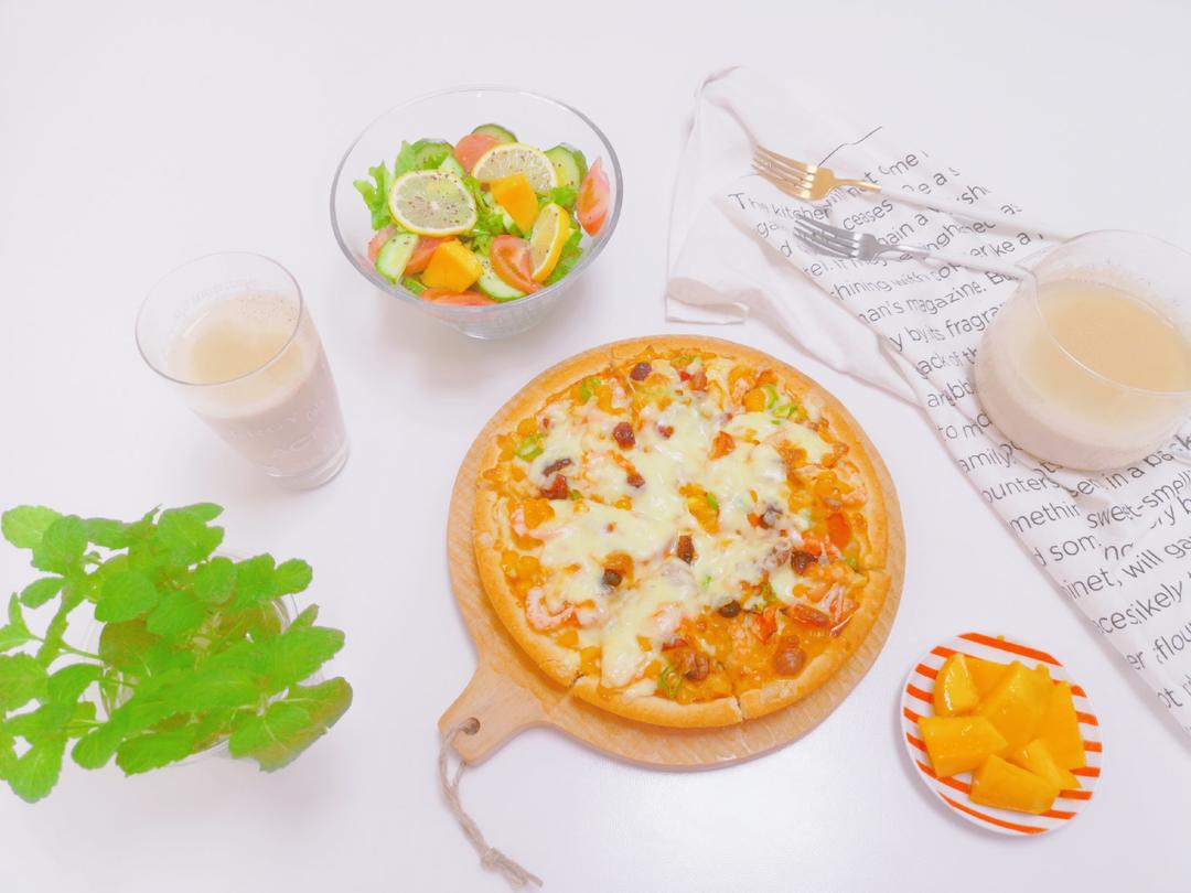 青溪555 做过 早餐•2020年4月19日 #早餐•2020年4月19日# 今日谷雨,有点阴天,温度也比每天稍低些,早餐做了海鲜披萨和热乎乎的奶茶,简单弄个蔬菜沙拉,吃得好饱,减肥计划可以先等等! 2020-04-19