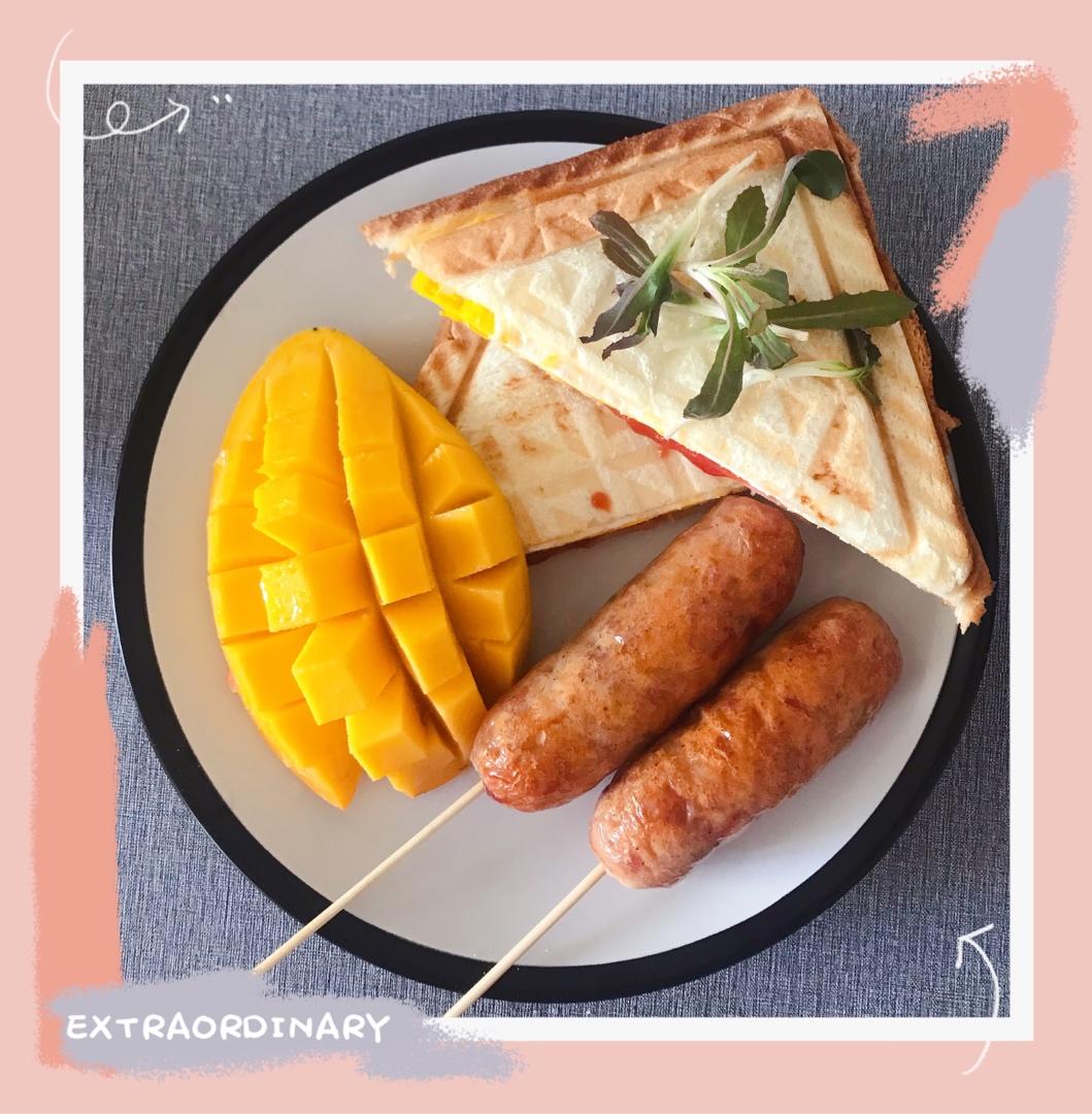 早餐:三明治、烤肠、芒果