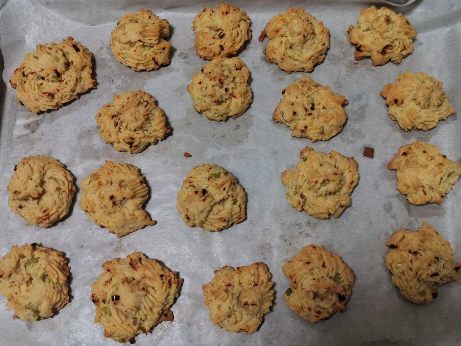 amysu_bj 做过 葱香小米辣曲奇 没有小米辣,用朝天椒剁碎,也不知是不是因为室温低,打发黄油费半天劲搞得到处飞溅,结果面团还有点干,用了洪荒之力挤出来,这形象实在有点丑,不过葱味还挺香,微辣解腻,就是忘了放盐,下次改进吧 2020-04-21