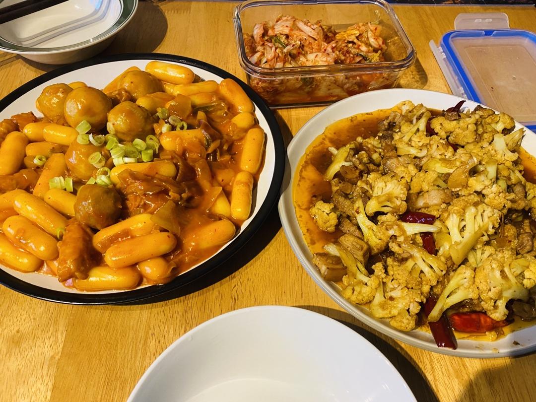 今日晚餐韩国芝士年糕+干锅花菜