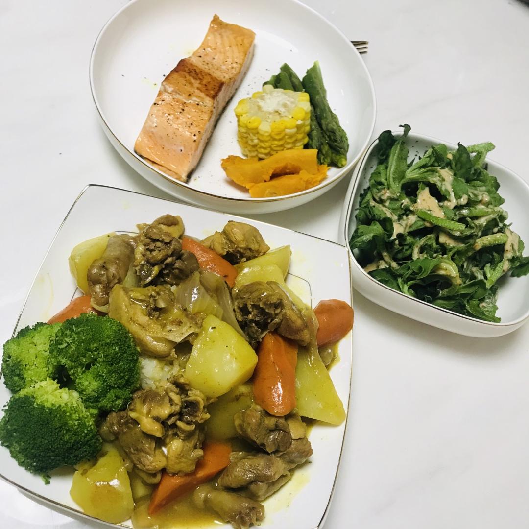 香煎三文鱼,咖喱鸡