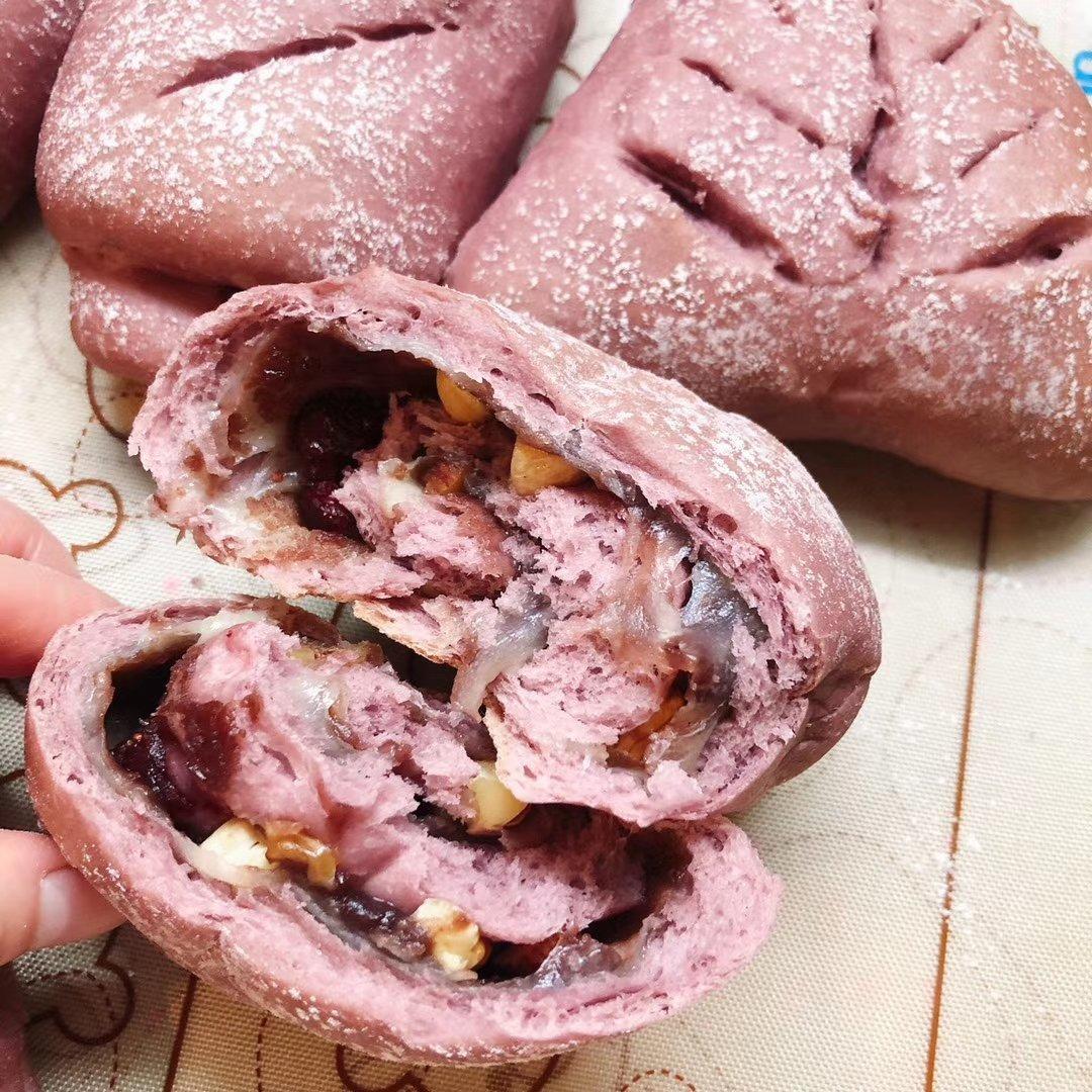 静滋味烘焙 做过 梦幻紫麻薯软欧包 💢春暖花开的心情~各类坚果和果干给面包增添了醇香的味道!软糯的麻薯,香甜的豆沙,清脆的果仁,裹在粉嫩浓郁柔软的面皮中,咬上一口,口感那是相当丰富哈[色]#早餐•2020年5月12日# 2020-05-12