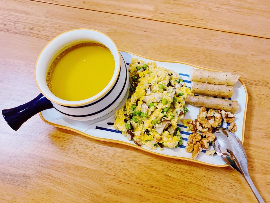 第一天大小米饭奶酪蘑菇豌豆蛋花饭+枸杞豆浆+熟铁棍山药+核桃仁