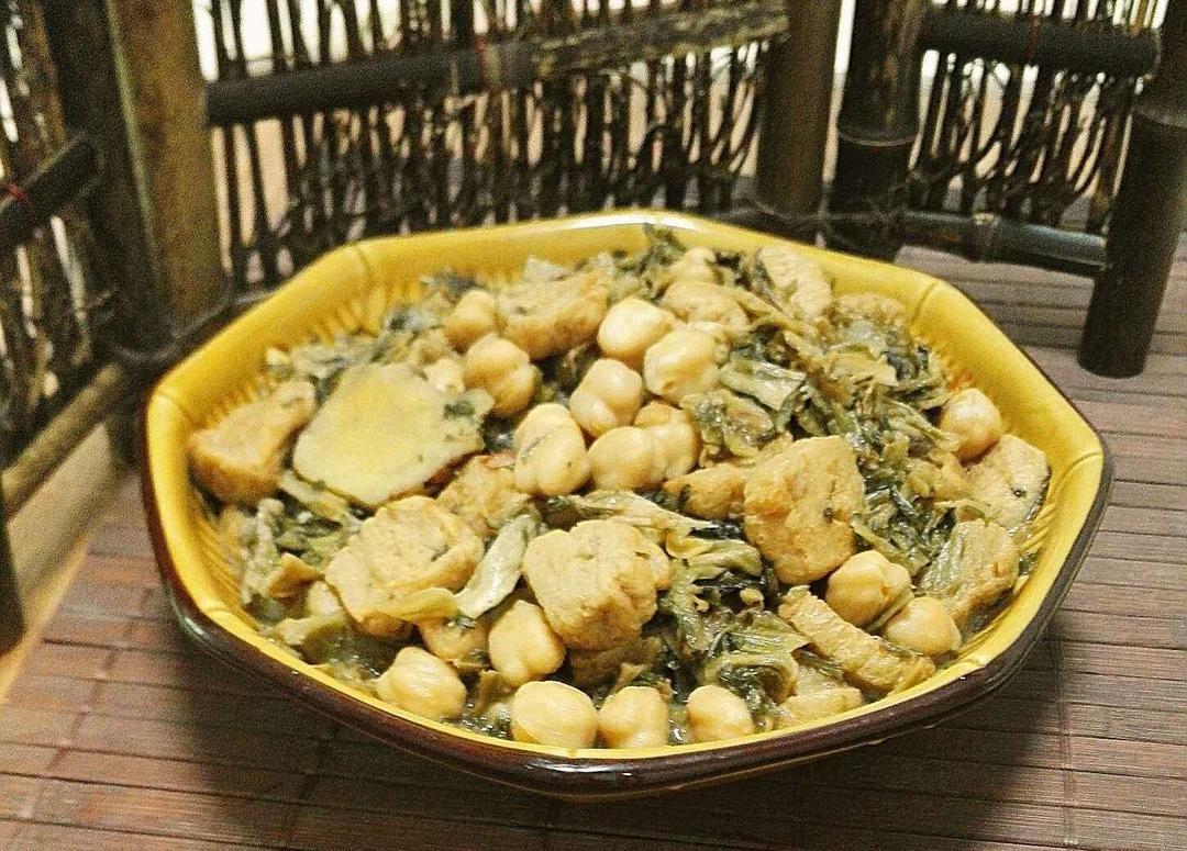5,少许油下锅烧热,下南姜片翻炒几下,倒进梅干菜,鹰嘴豆,下少许竹盐,生抽,翻炒均匀,放高压锅,加水没过食材,开大火喷气后,关小火煮二十分钟以上,然后熄火放凉,开锅,再倒进炒锅,再加些开水,下素蛋白肉粒,煮至全部食材熟透,下香菇精,翻炒均匀入味,即可装盘上菜!
