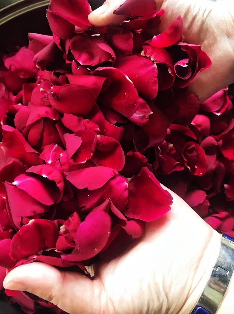 加入砂糖在掌中揉搓,让其渗入到花瓣的每个细胞,再倒几勺蜂蜜搅拌