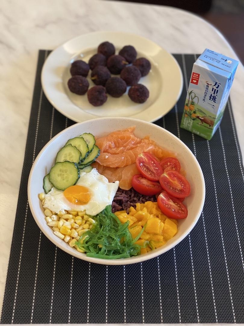 早餐打卡,三文鱼波奇饭,紫米饭打底配上三文鱼和各种蔬菜,乐纯的水牛奶很不错,推荐给不爱喝奶的娃。