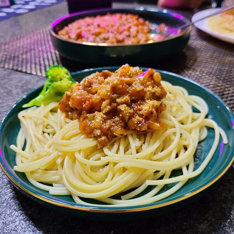 蓝桥的风月 做过 (完胜必胜客的)番茄肉酱意大利面~ 不是我骄傲啊 是真的觉得必须得到夸奖和小红花的啊 配料基本就是图三所见 最后装盘以后加了芝士粉 炒酱是真的用了不少心 时间久一点 味道更醇一些#晚餐•2020年8月2日# 2020-08-02