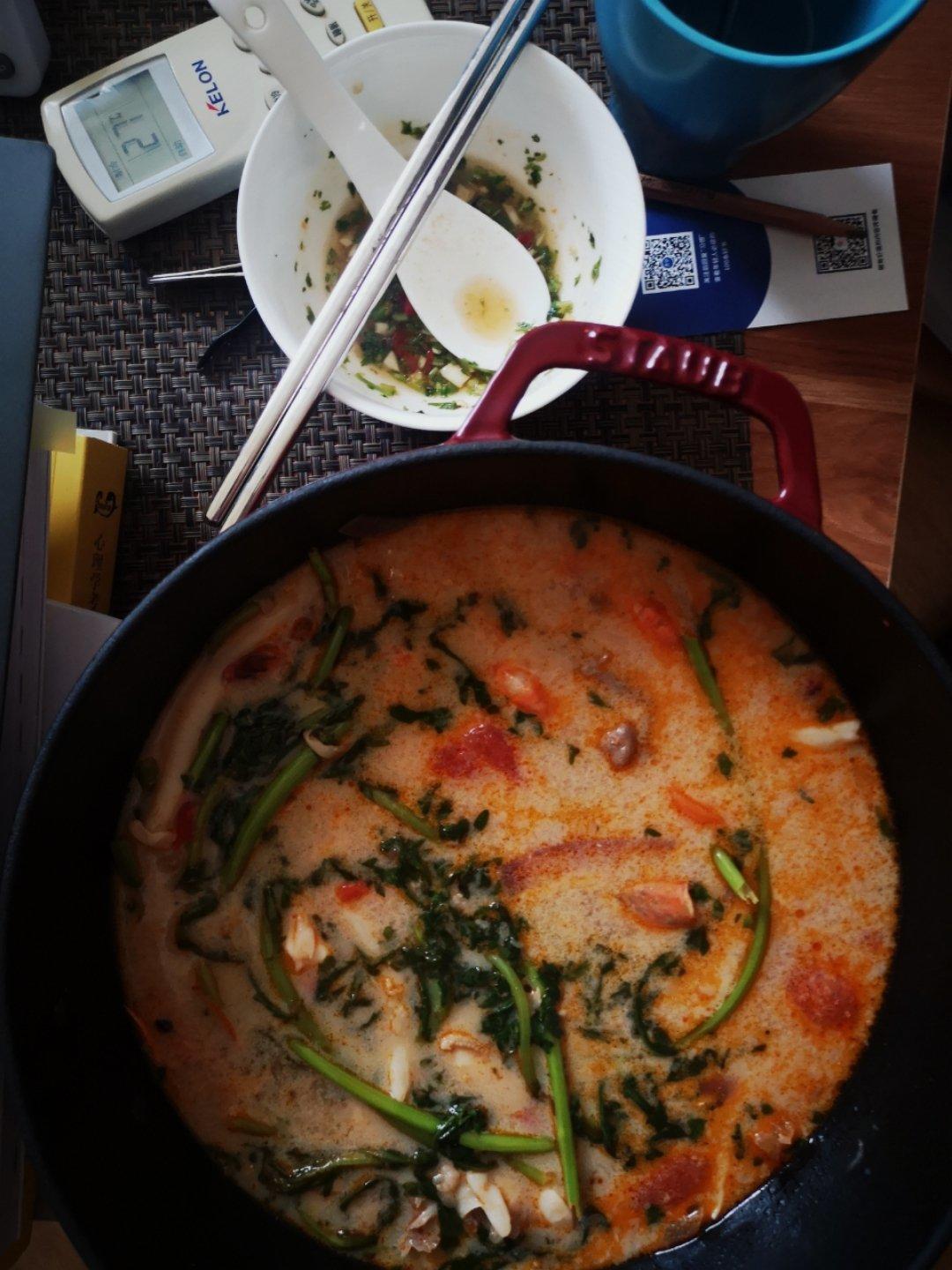 维生素A 做过 被夸爆的冬阴功汤【泰国学厨】超级好操作! 高汤加入了玉米白菜和白萝卜,配料加了冬阴功酱块和有心虾酱,煮了鲍鱼虾茼蒿海鲜菇和河粉,最后放了点肥牛简直太好吃了~对了还调了酸辣口蘸汁,绝了#午餐•2020年8月5日# 2020-08-05