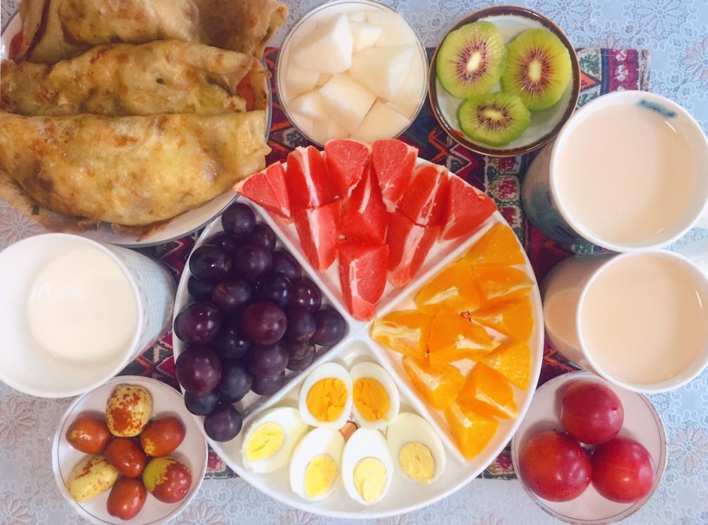 猫猫家的早餐:里脊肉培根香肠蛋饼、鸡蛋、咖啡牛奶、红心奇异果、梨、樱桃李、枣子、西柚、甜橙、葡萄…