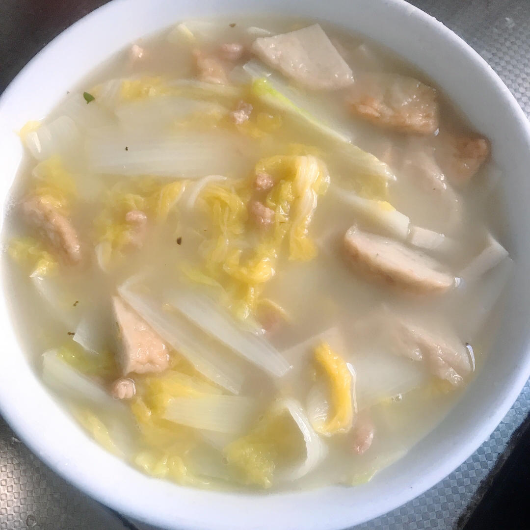 做成了海米娃娃菜汤,加了鱼饼鱼豆腐