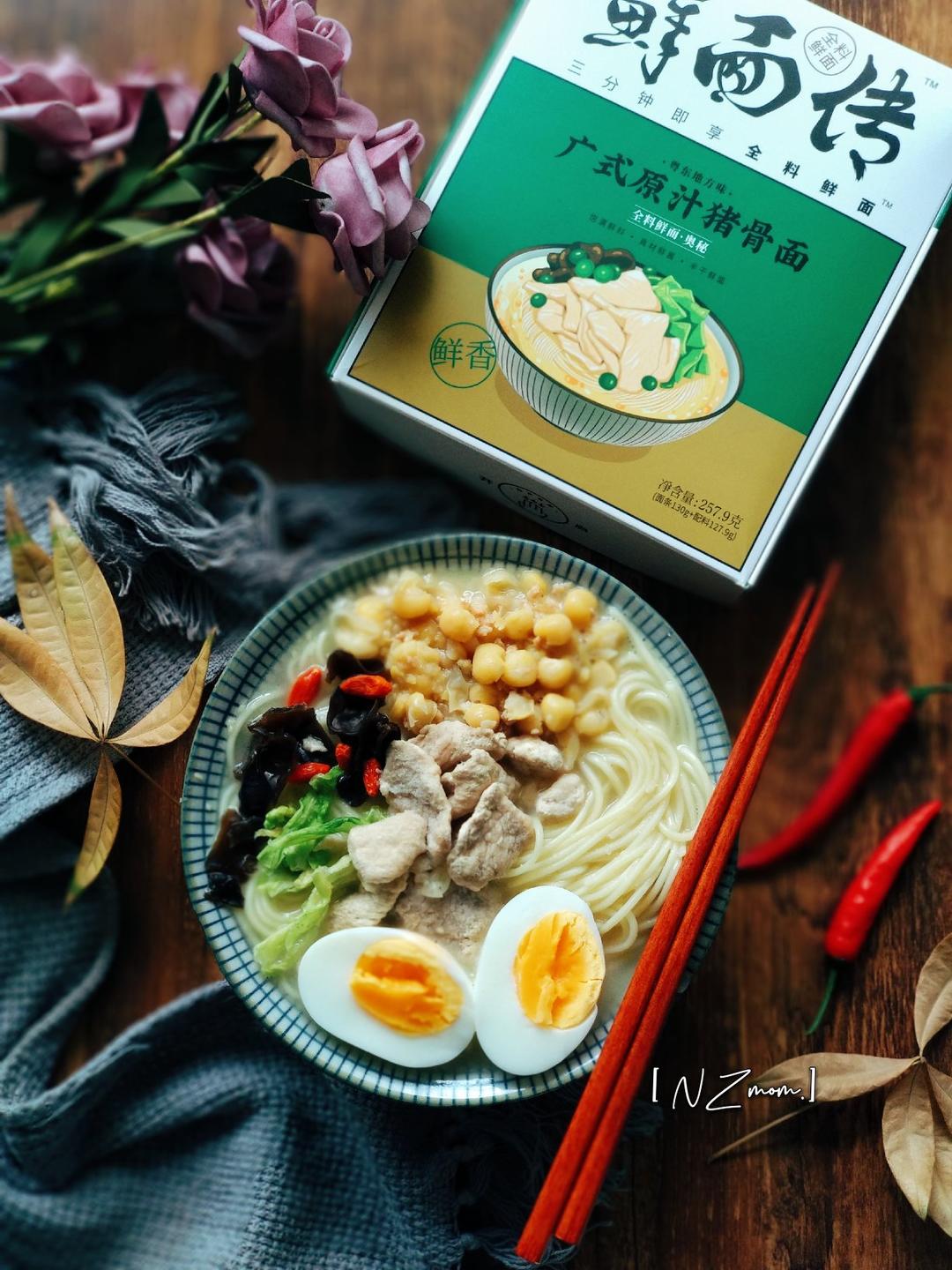 #晚餐•2020年9月13日# 今天品尝了鲜面传🍜广式原汁猪骨面,整体味道是喜欢的,三分钟就可以吃到这么一碗猪骨面,棒棒哒啦!汤底很鲜,鲜面条的口感一人份,配菜有黑木耳,白菜,枸杞,这三种分量不多需要提前放汤底泡软。二师兄的肉倒是蛮多的,眼见的肉块,是冻干技术处理的,还蛮好吃的。还有一包元气豌豆包,一开始看外包装图片以为是绿色的豆豆,实际是黄色的豆粒,加入面中增香。另外自己加了一粒水煮蛋,美美的一餐了~