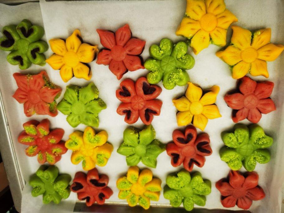 绿色是开心果味的,从来没有试过,红色是红丝绒,黄色是南瓜粉,颜色烤完出来也很正,包了两种馅料,一种椰蓉一种紫薯