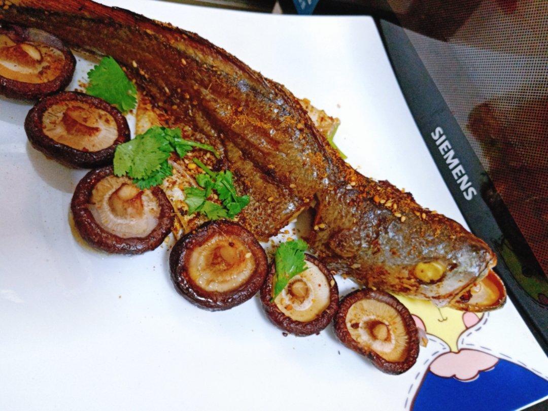 这黄鱼有点顽固,愣是没给摁平啊,这样烤皮酥肉嫩啊,好吃!