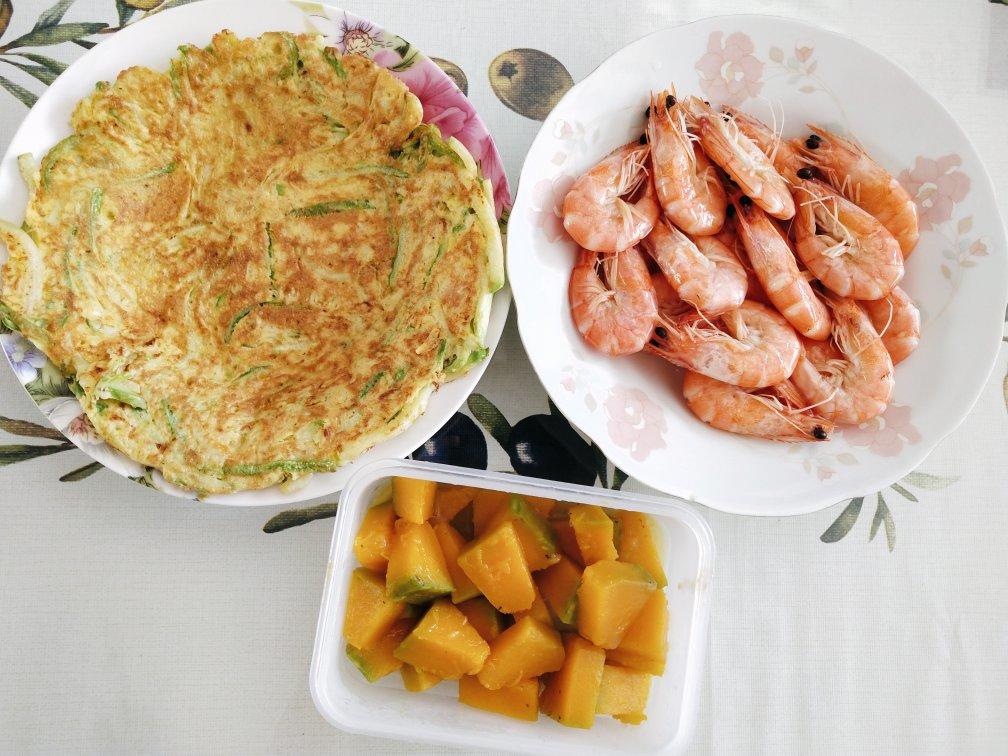 10.6早餐:荞麦面拌黄鳝丝,中餐:南瓜、西葫芦摊蛋饼、白灼虾。