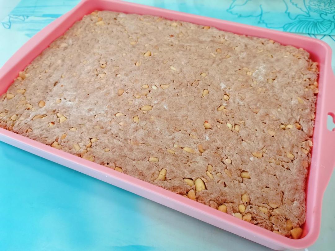 汤汤-不吃榴莲 做过 牛轧糖 第一次尝试,害怕失败,所以没加太多料;结局意想不到的成功,味道也超赞。配料如下:黄油:35g,不粘锅小火融化;加棉花糖:250g,炒至黄油棉花糖融合,关火加奶粉:100g and可可粉:5g(提前搅匀)搅拌均匀;加花生碎:230g拌匀,带一次性手套抻拉几次,让花生碎全部裹上棉花糖;装盘压实,放凉切块儿,装袋密封保存。60块的量 #牛轧糖# 2021-01-30