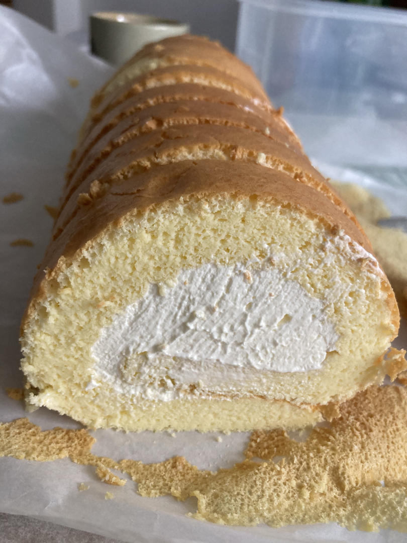 回缩的挺多不过可能是因为鸡蛋比较小,内部还是熟了的,口感很不错,也没有特别薄,可以接受....卷的时候有点掉皮,应该是操作的问题,下次先打好奶油速度快点应该就没问题的。