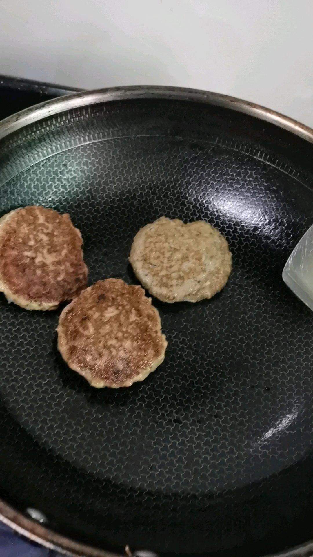 第二次做,记得第一次做的时候(用的猪肉)饼子拿起来有点散,但是味道很好也很嫩,琢磨是不是我的肉绞得不够碎或者其他原因,今天用的鸡胸肉,看看我的视频,很Q弹啊有没有,怎么折腾都不碎而且弹性超棒,完全按方子。基本上我只是把肉绞得比第一次碎一些,然后下锅前让肉团子在手里来回丢个二三十下,我带了手套,可以抹点油在手上不然很沾手,最后啪叽丢进锅里,注意别把油溅起来哦,等饼子定型了翻面再压,完美👌一般丢一个就可以翻前面一个,再前面那个就可以起锅了😋