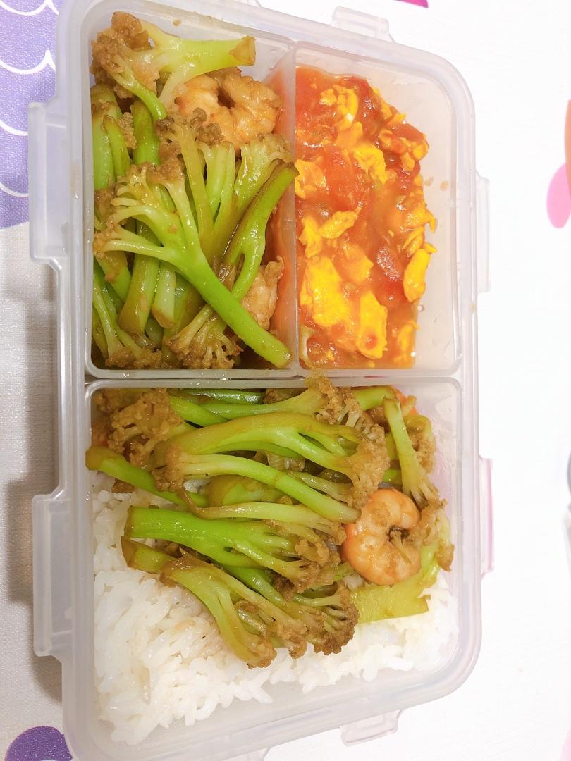 明日便当:我恭献的番茄炒鸡蛋、老公贡献的花菜炒虾仁(比心♥️)