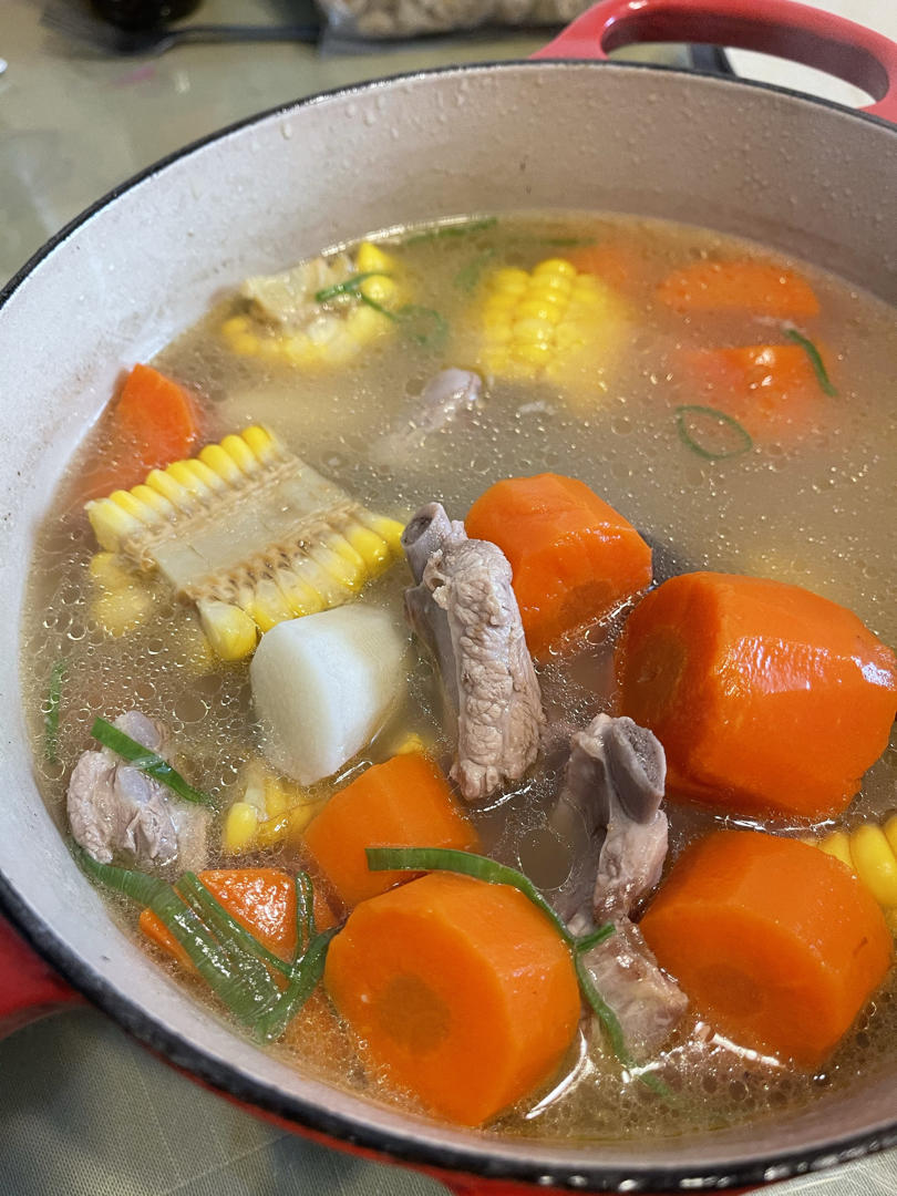 格瑞斯呢 做过 连吃三碗的玉米山药排骨汤 炖了1个半小时。1. 胡萝卜可以切两块大的,在一开始就放进去煮,取其甜味。同理红枣也可以在一开始就放进去。2. 排骨买好的,用纯净水或矿泉水熬汤。3. 真的只加盐,就很甜。 2021-04-03