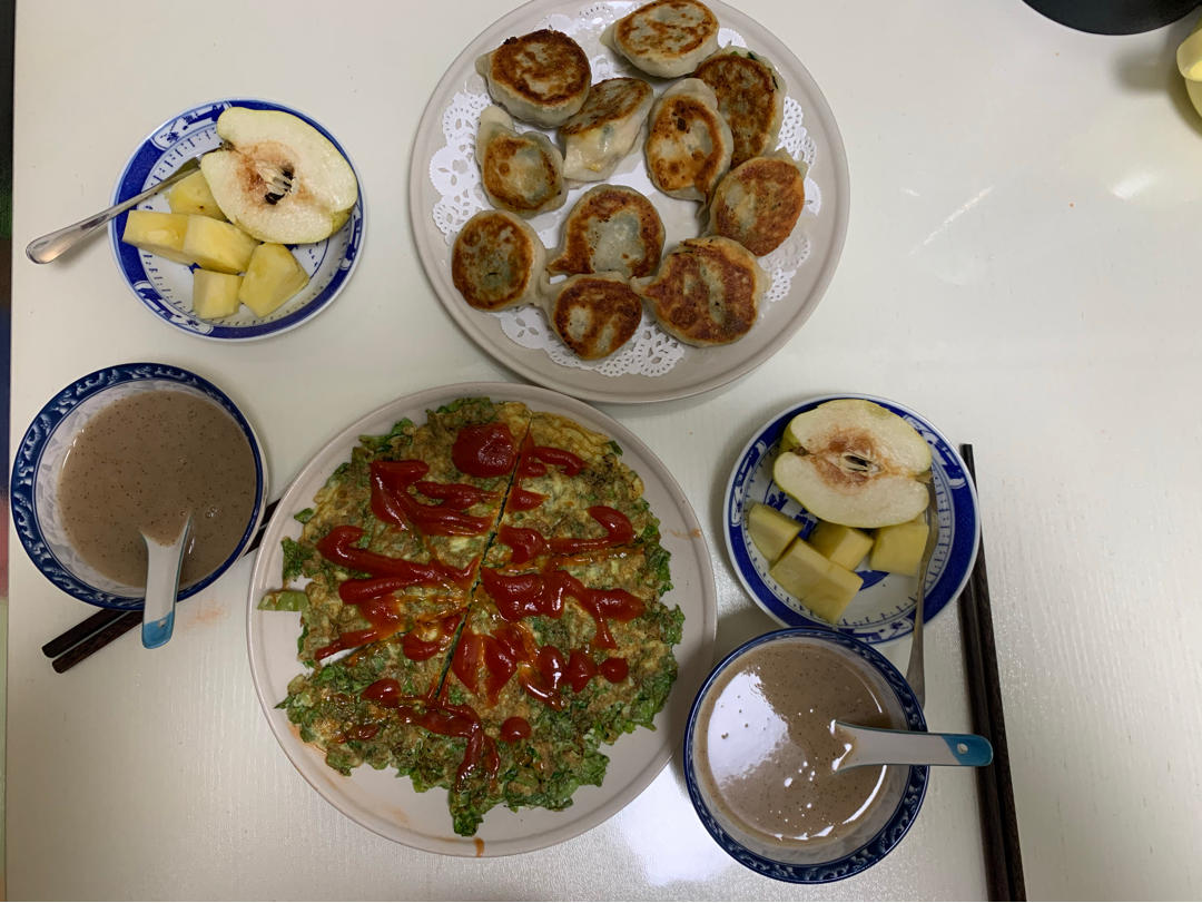 山药红枣小米糊➕鸡蛋生菜饼➕素馅煎饺