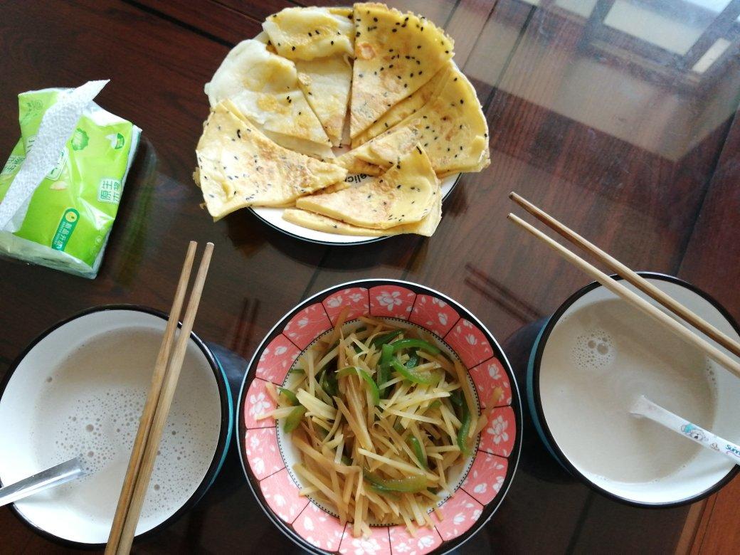 今天周末,给小哥哥做顿美美的早餐,两种鸡蛋饼,➕青椒土豆丝➕豆浆(花生➕黄豆➕红枣)😍