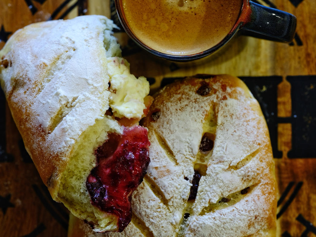 特别好用的配方!小改动:用一点点果酱代替了蜜豆。面团里放了核桃和蔓越莓。