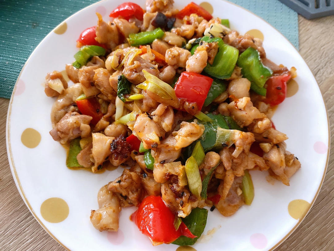 加了青椒红椒和蒜苗,再多加了一勺豆瓣酱。炒出来鸡肉嫩滑又好吃~