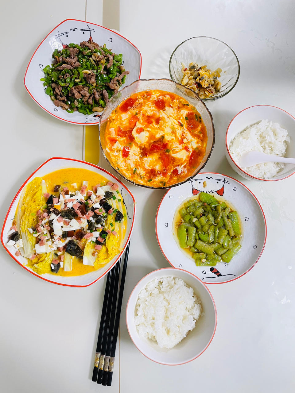 上汤娃娃菜+蚝油丝瓜+青椒肉丝+番茄蛋汤