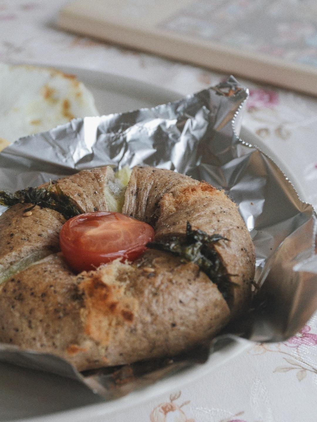 evedooo 做过 ❗️减脂低卡,贝果三明治的N种吃法(不断更新中) #早餐•2021年9月5日# #贝果贝果# 贝果新吃法get!贝果从表面切成六小段,不用切断。在每个小段里加上芝士、肉松等等自己爱的小料,中间放上一颗小番茄,送进烤箱~完成!香喷喷!😍😍😍 2021-09-05