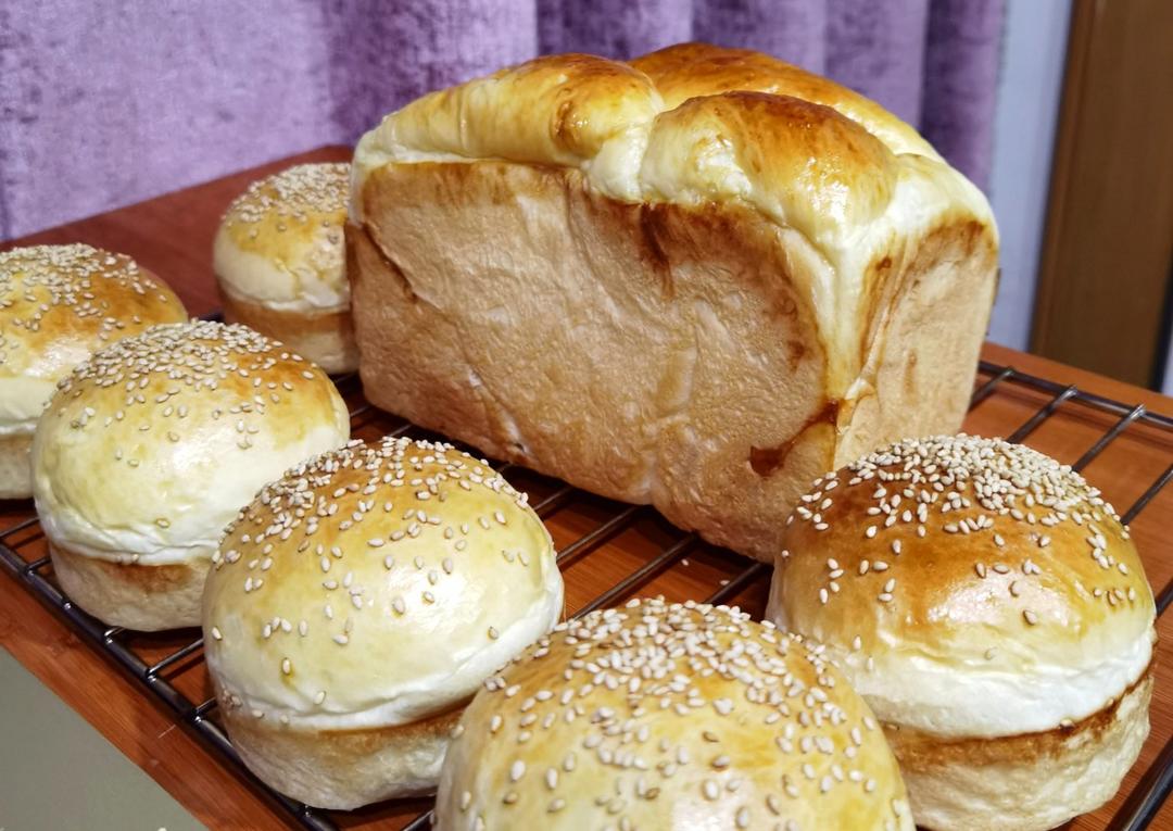 台风天在家烤面包,晚上光线不好,还是急着来交作业啦!500克粉量做了一个吐司,六个汉堡胚,超级香软,汉堡胚软的差点拿不起来!