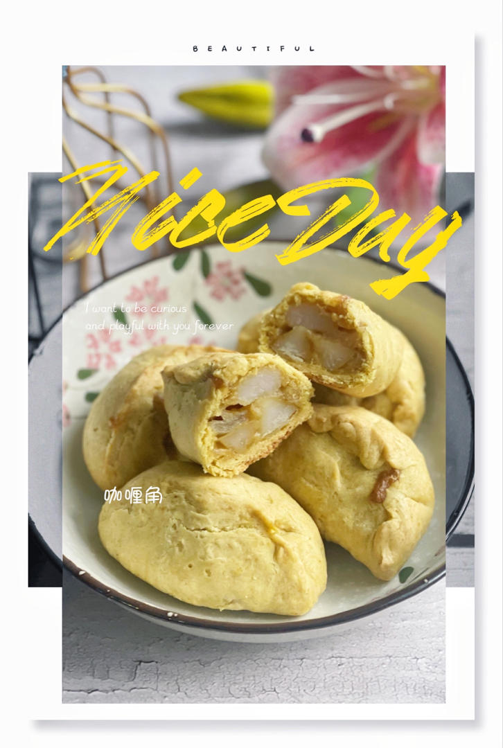 內餡的配料要切小一點,不然真的好難包起來!皮也加了咖喱粉和一點鹽,整體味道不錯