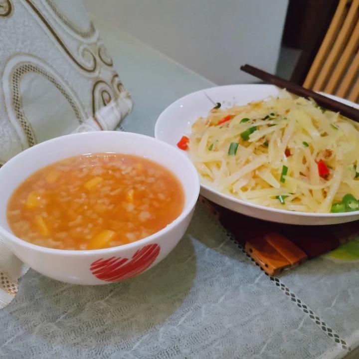 老红糖红苕稀饭,再配上一碗爆炒土豆丝,绝绝子。