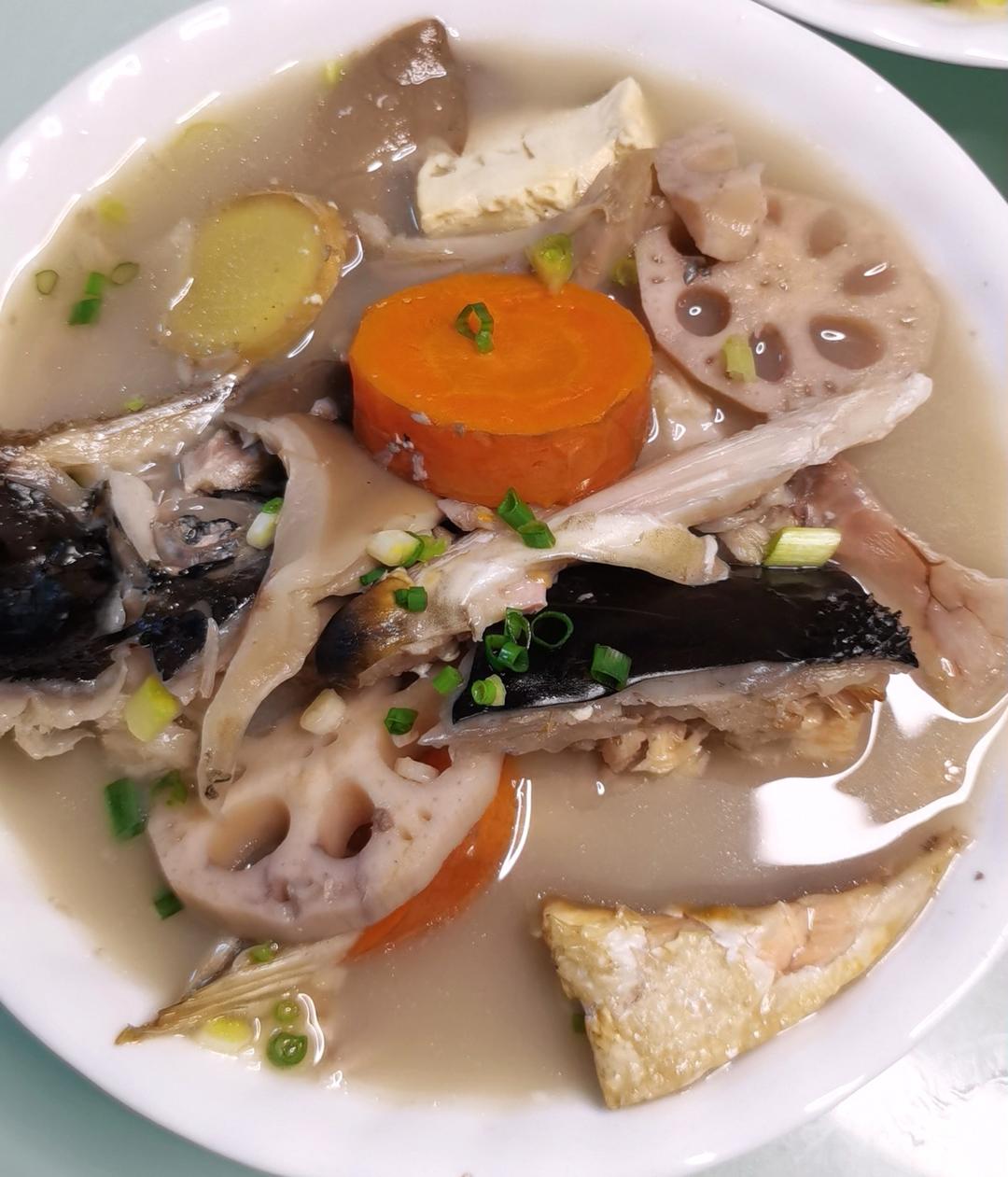 莲藕、胡萝卜、豆腐、平菇三文鱼头汤:无添加油,盐2g