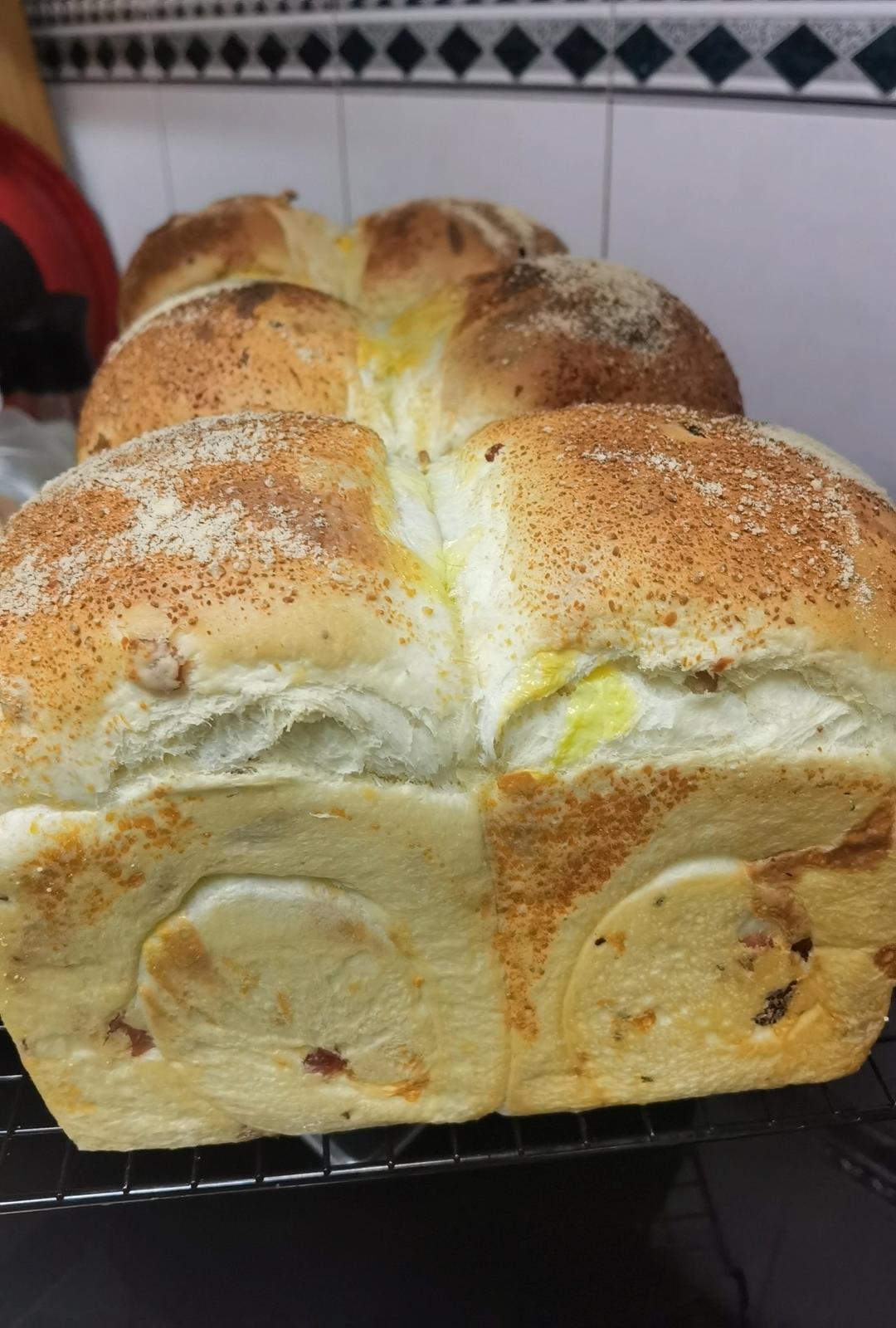 用了350克老面,一包培根,10片芝士,298一个面团,170.220,32分钟,下次要增加几分钟
