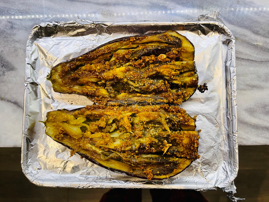 用的胖茄子,烤了至少30分钟,扎了几个孔,很好吃,就是有点咸