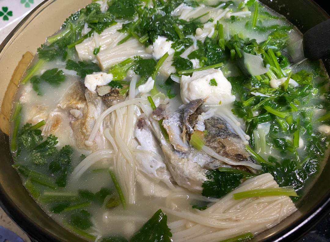 rattler 做过 鱼头豆腐汤 #晚餐•2021年12月12日# 大火少许油一点盐,鱼头煎至两面金黄色,放入生姜,开水,煮沸后加入葱,大火直至汤变白色。加入豆腐,过一会加金针菇,汤开后加盐调味,最后加香菜末。 2021-12-12