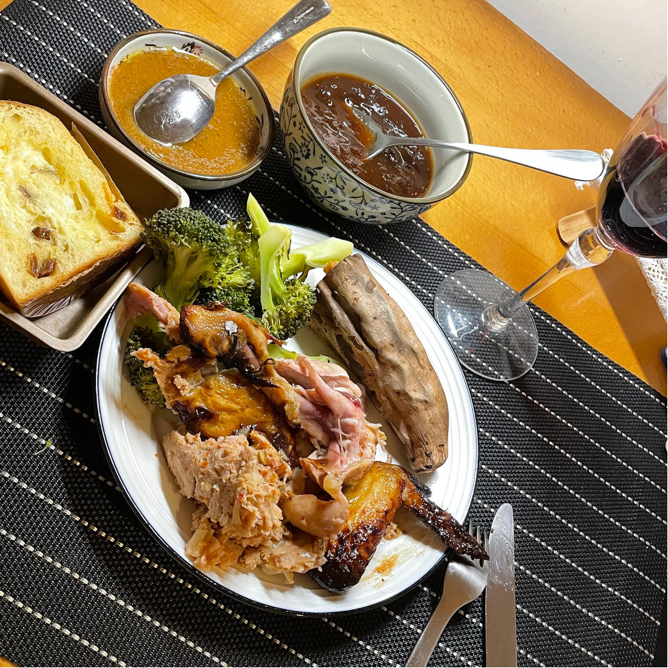 鸡在盐水里泡了四个小时,gravy,小红莓酱,潘潘,yam,一个也没落下😄