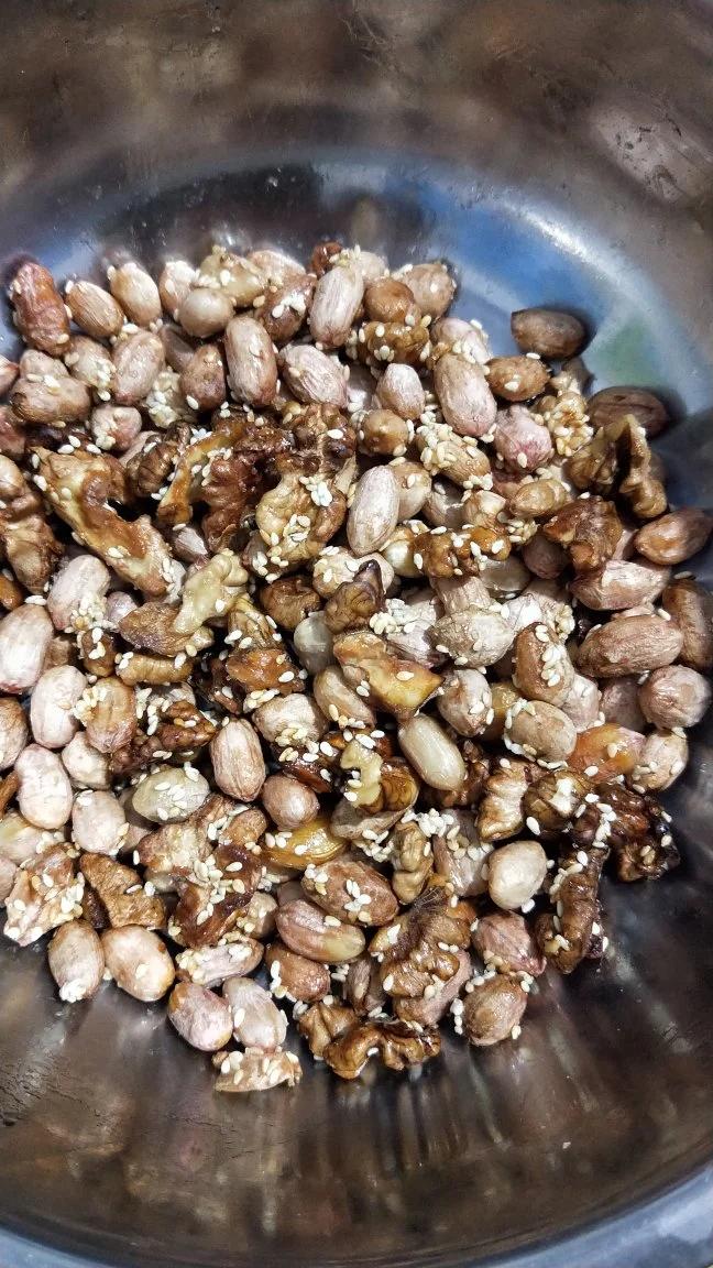 7702_g4l5 做过 空气炸锅美食18-蜂蜜琥珀核桃仁 核桃太少加了点花生,水煮5分钟去涩味,控干水放容器中,加入白糖蜂蜜白芝麻拌匀,倒入空气炸锅160度20分钟,中间翻翻,省事 ,下次加红糖试试。 2022-01-20