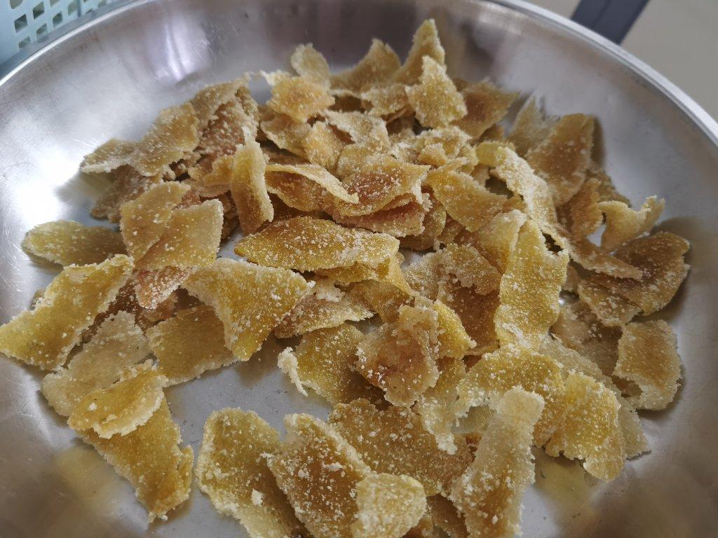 rickyffff 做过 柚皮糖(附不苦不涩小技巧) 爸爸要把柚皮白色的肉拿来做菜,所以只留下一层薄薄的皮给我拿来做糖了,泡了一天没有完全清洗干净。还是有点苦的,吃起来有点咸金桔的味道~我这个皮只有130g,所以翻炒了大概10分钟就开始析出糖霜,加了点柠檬汁过多两三分钟就完全做好了,只是不知道为啥吃起来有点麻麻的😝 2022-01-20