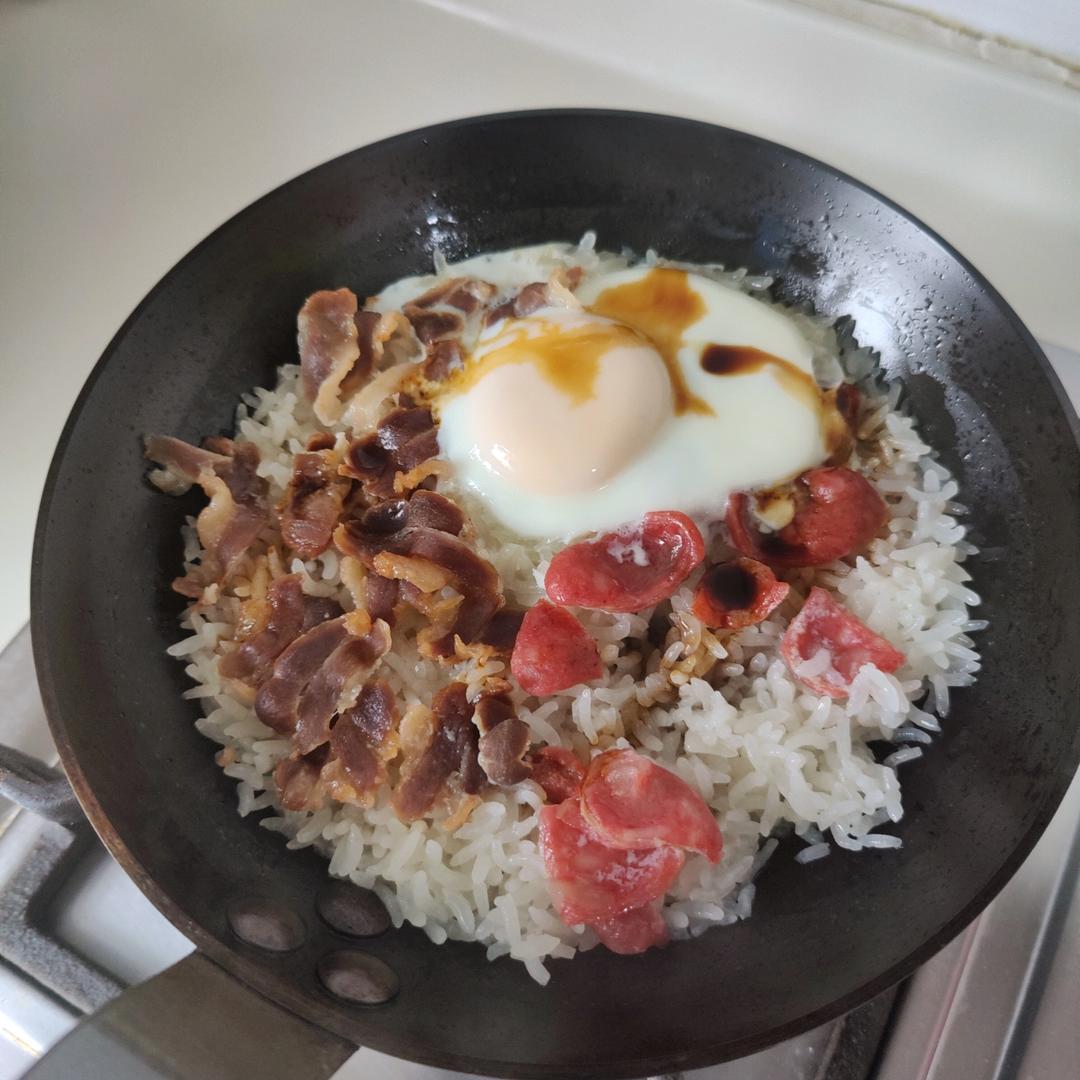 简易版煲仔饭,20cm碳钢锅一人份,煮开以后就转了最小火,大约15分钟。锅底仍有一些脆脆的锅巴但是没焦,挺好吃的。