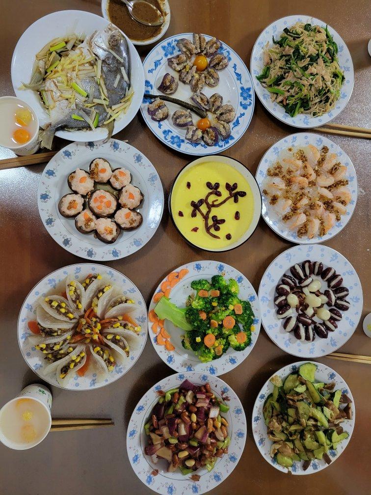 佳佳_5jok 做过 2022年02月01日 2022年的年夜饭,依次是发财树,茄子百合,腊梅报春,笑口常开,香菇酿虾滑,金玉满堂,蒜蓉粉丝虾,清蒸鲳鱼,黄瓜拌猪耳朵,菠菜拌鸡丝,老醋花生。这一桌准备了大概两个小时左右,既快手,又健康少油。 2022-02-01