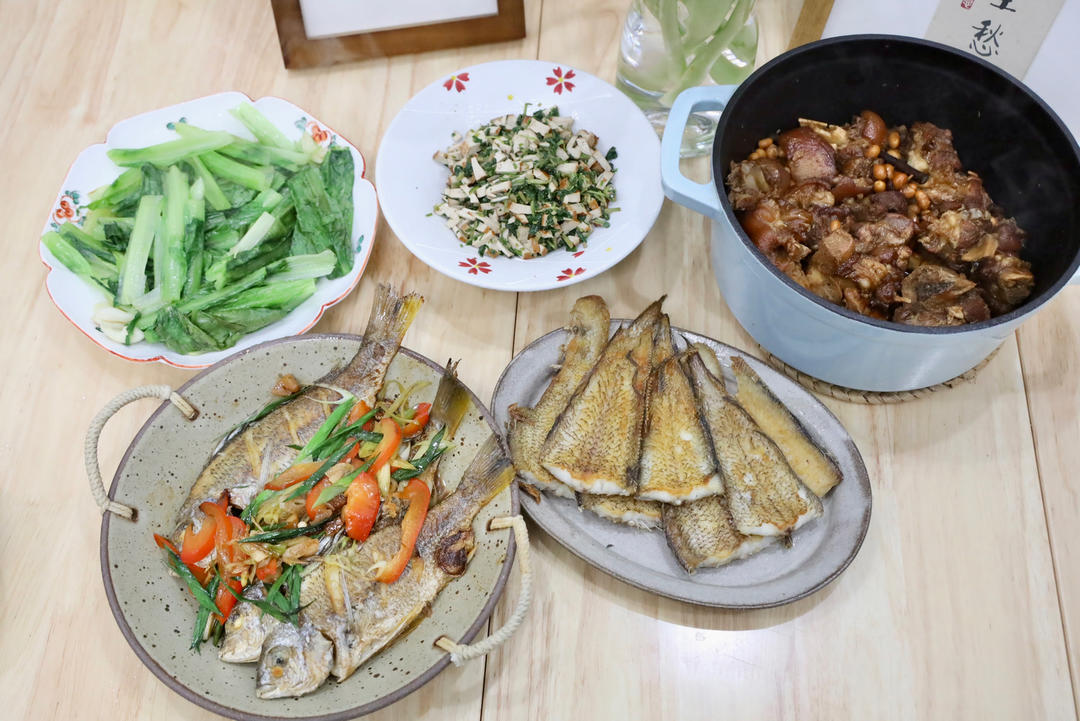 昨日晚食:酱油水黄翅鱼🐟➕干煎不明鱼➕凉拌马兰头🌱➕黄豆红烧猪蹄
