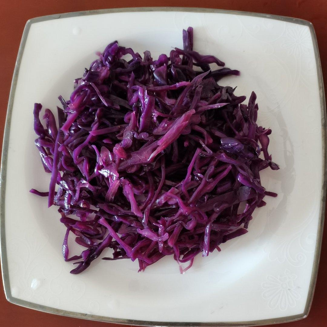紫甘蓝切丝,水开烫至断生,拌入稀释油醋汁,加少许柠檬盐,一道减脂菜就做好了