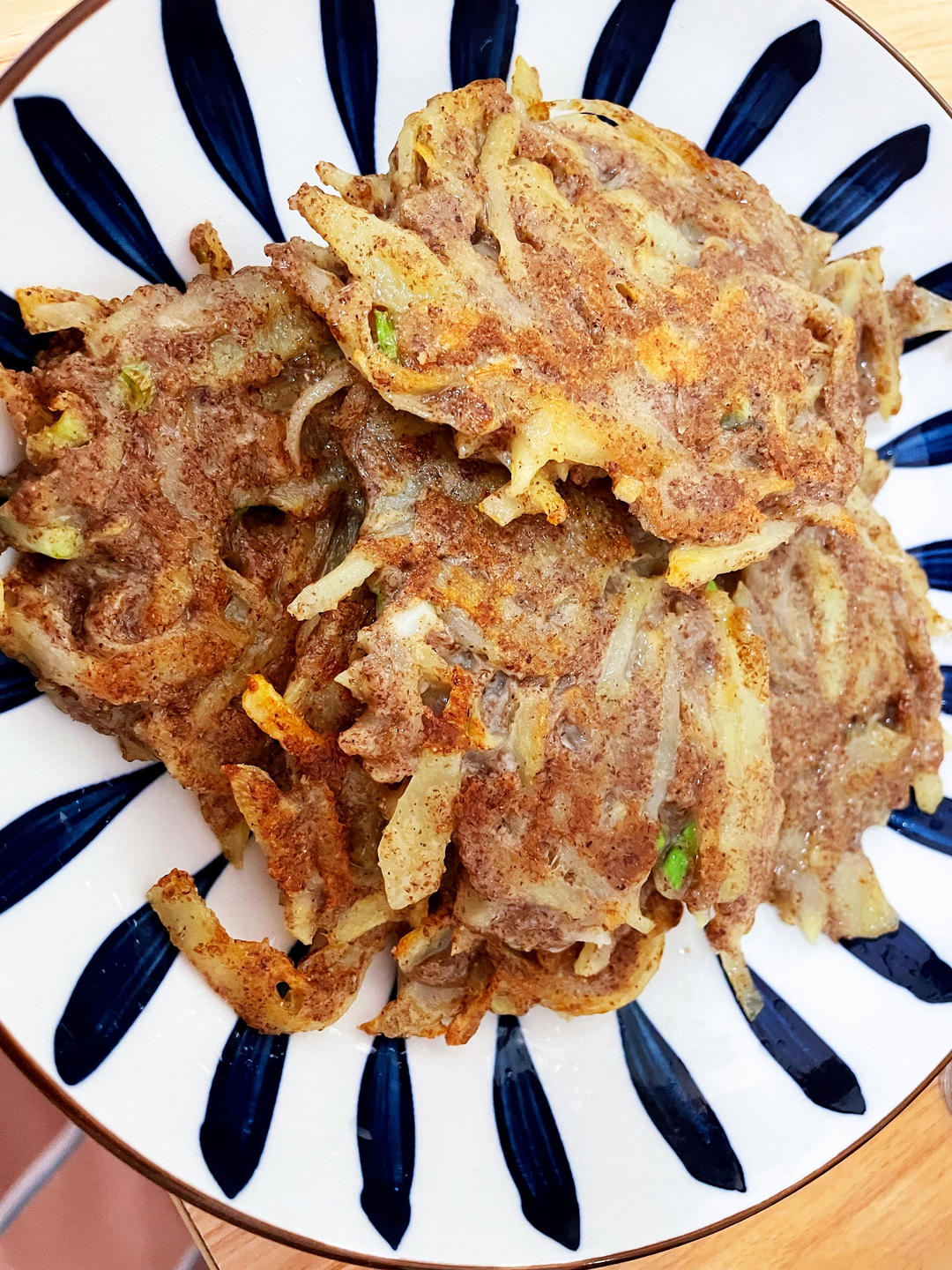 没有白面粉用的荞麦面粉,加了葱、一点盐和黑胡椒粉,味道也不错👍