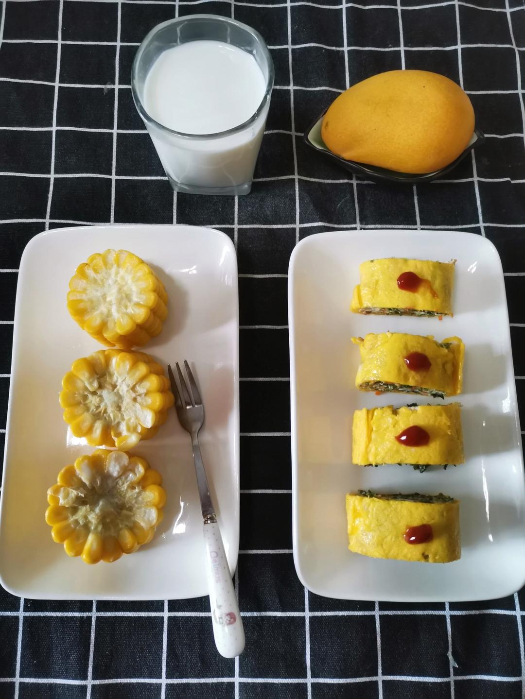 奶香玉米*海苔蔬菜厚蛋烧*牛奶*芒果