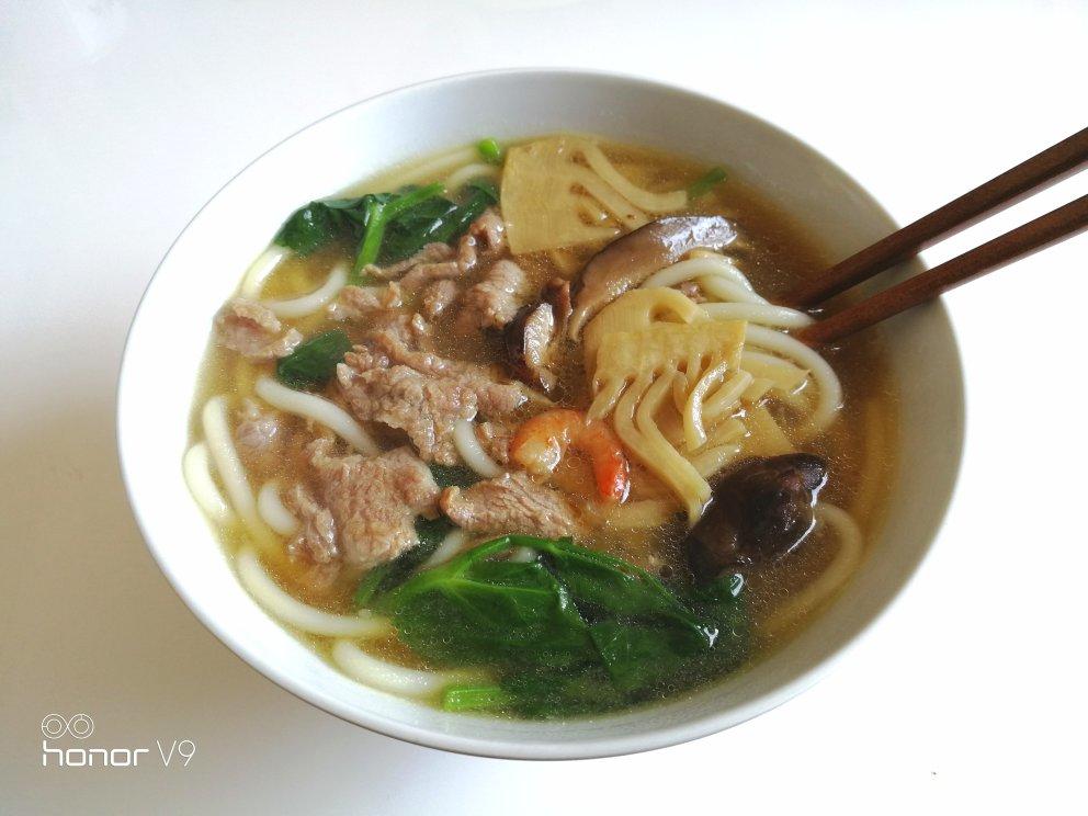 早餐烧饵块夹油条,中餐山笋、香菇、海米、鸡腿螺烩四鲜,学习外省做法生滚鲜肉煮米线味道不错。