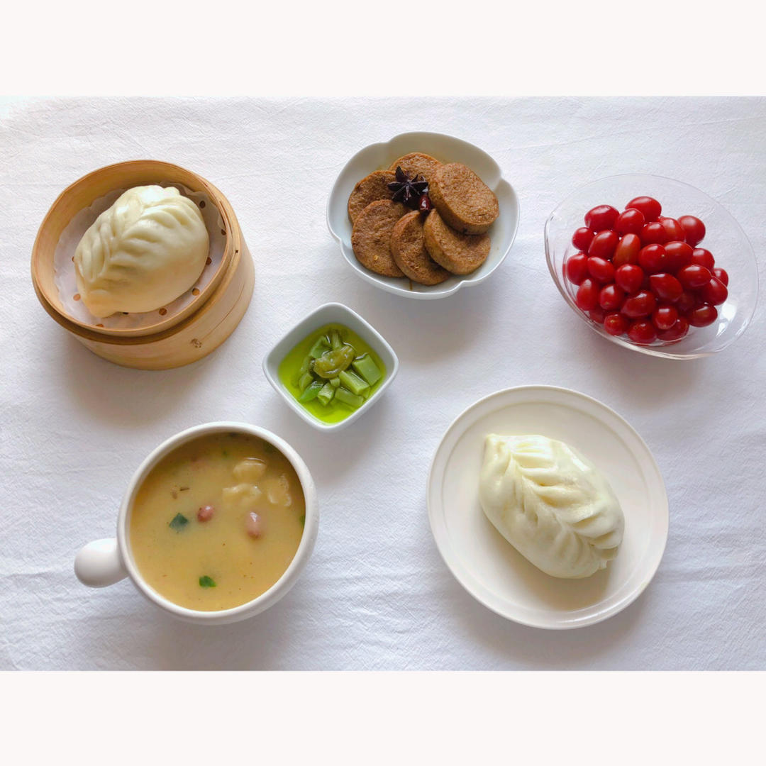 甜沫➕芸豆排骨包➕红烧素鸡➕泡椒贡菜➕小柿子